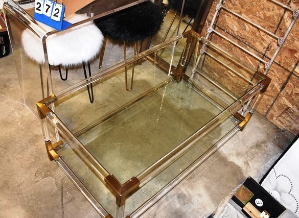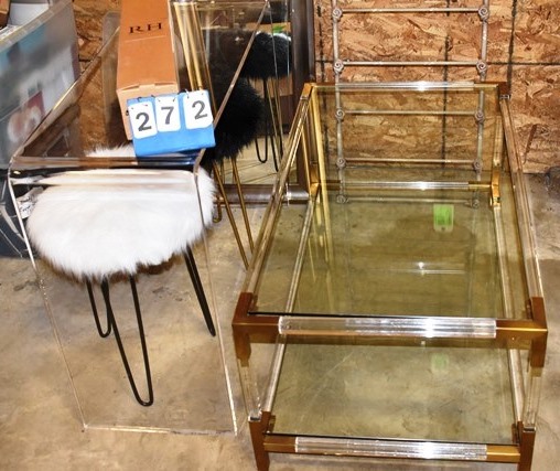36" W Plexiglass Stand, 43" x 24" Glass top Table, Mirror, Etc.