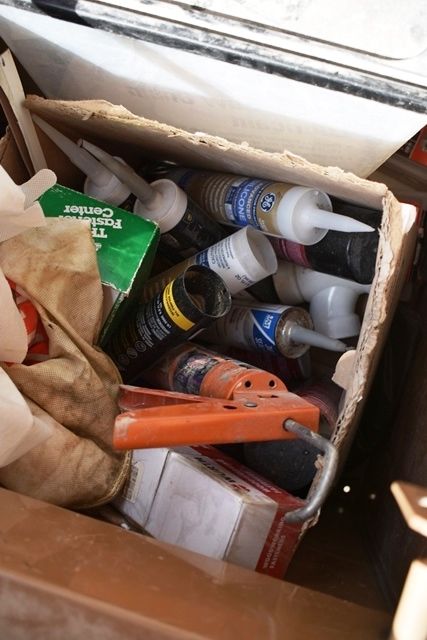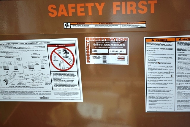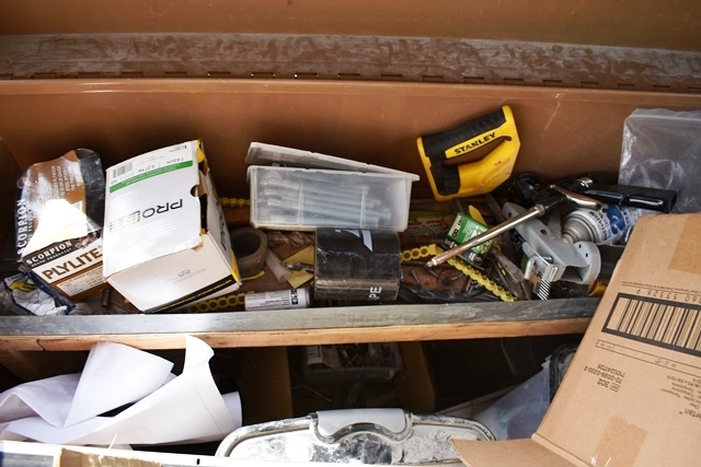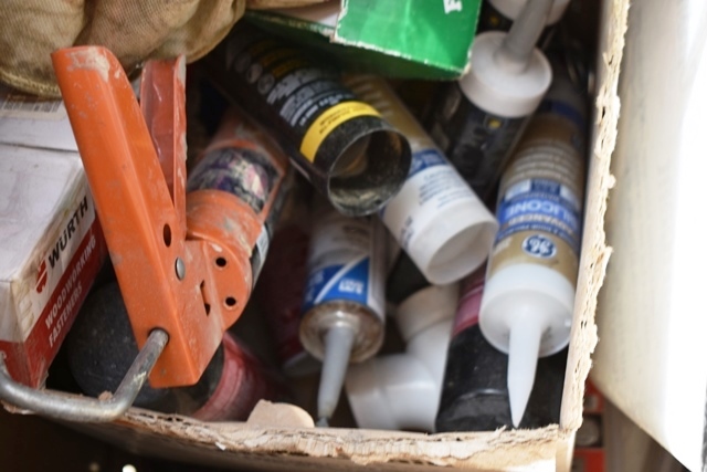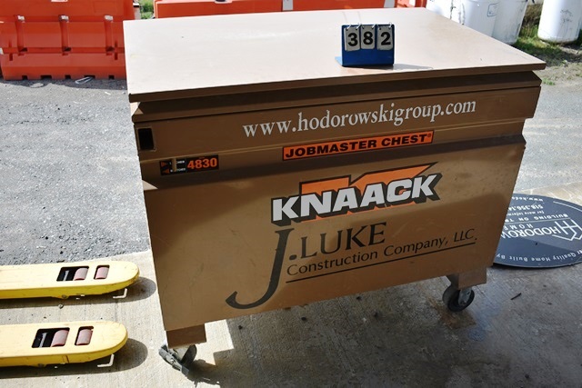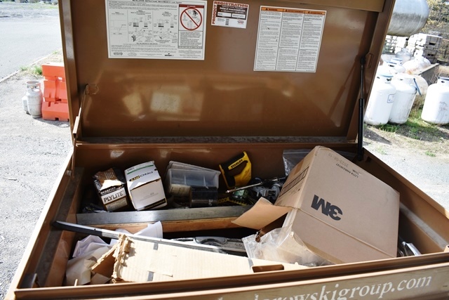 Knaack Model 4830 4-Wheel Job Site Box with Contents Including Hack Saw, Screws, Nails, Caulk, PVC, Etc.