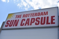 #129 - Rotterdam Sun Capsule Sign, Approx. 8'W Buyer Gets Only Sign Panels, Buyer Responsible For Removal Will Need Ladders and Certificate of Insurance to Ensure Safe Removal.
