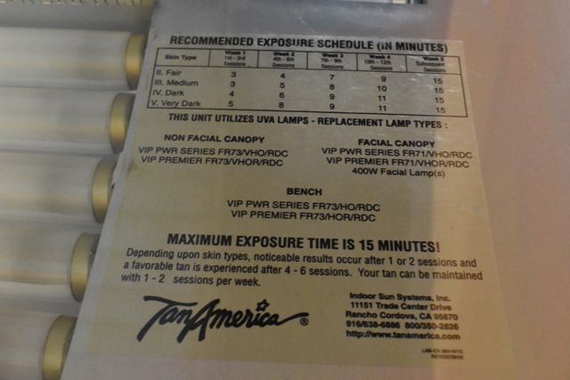 Tan America VIP 3600 Series Pacifica Tanning Bed (18) – 160 Watt Reflector Lamps Canopy, (18)-100 Watt Reflector Lamps Bench, (3)–400 Watt Facial Tanners, AM/FM/CD/iPod Premium Pioneer Sound System with 4 Speakers, Built In Integrated Tmax Timer Wireless Compatible Twin Turbine Adjustable Air Shower with 5 Vents, A/C Compatible 89”L x 48”w, 638 lbs, 220-240V with Ground Required, 3 Wire (2 Hot, 1 Ground), 40 Amp Breaker Minimum, Plus 110V Outlet for Stereo. 89"L. Buyer Responsible for Safe Disassembly and Removal, Must Provide Certificate of Insurance Prior To Removal Day, Power Will Be Disconnected After Preview Day.