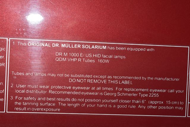 Dr. Muller Giant Sun Tanning Bed 54 Lamps, (4)-1000 Watt Facial Plug In Lamps, (21) 160 Watt Bench Tubes, (29) 160 Watt Canopy Tubes, Fully Adjustable Facial and Body Fans, Single Phase, 10 Minute Max. Time. 86"L. NEEDS MAINTENANCE. Buyer Responsible for Safe Disassembly and Removal, Must Provide Certificate of Insurance Prior To Removal Day, Power Will Be Disconnected After Preview Day.