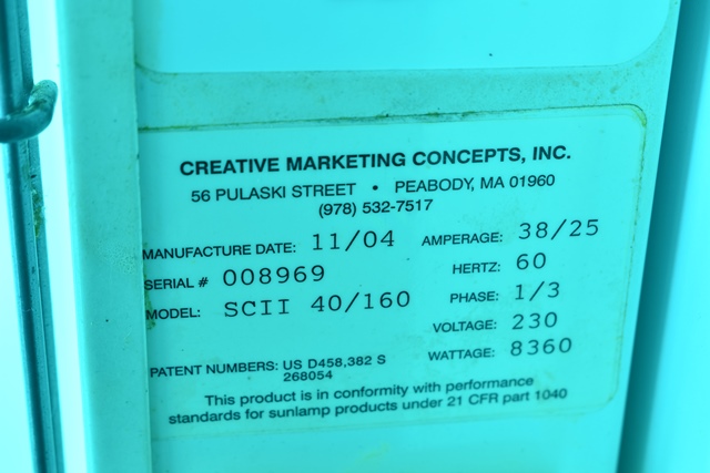 The Sun Capsule Is A Great Space Saver With A 12 Minute Total Tan Time, An Attached Changing Room and Has Built In Speakers and Fan. This Allows Many Options For Placement of This Unit As It Does Not Need To Be Confined To A Room. This Unit Runs With 220V / 70A On 3-Phase Power And Has A Total Of 5,270 Hours. 84" x 88". Buyer Responsible for Safe Disassembly and Removal, Must Provide Certificate of Insurance Prior To Removal Day, Power Will Be Disconnected After Preview Day.