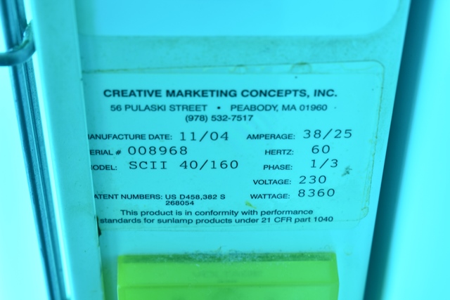 The Sun Capsule Is A Great Space Saver With A 12 Minute Total Tan Time, An Attached Changing Room and Has Built In Speakers and Fan. This Allows Many Options For Placement of This Unit As It Does Not Need To Be Confined To A Room. This Unit Runs With 220V / 70A On 3-Phase Power And Has A Total Of 5,208 Hours. 84" x 88". Buyer Responsible for Safe Disassembly and Removal, Must Provide Certificate of Insurance Prior To Removal Day, Power Will Be Disconnected After Preview Day.
