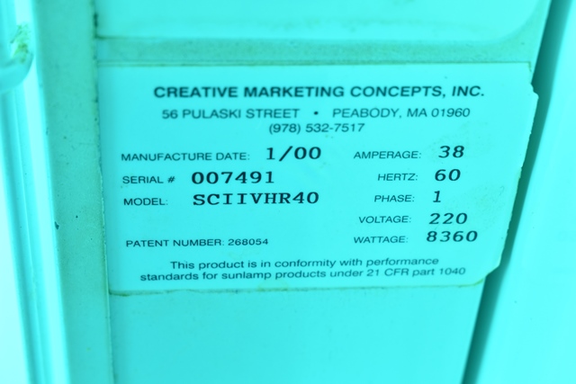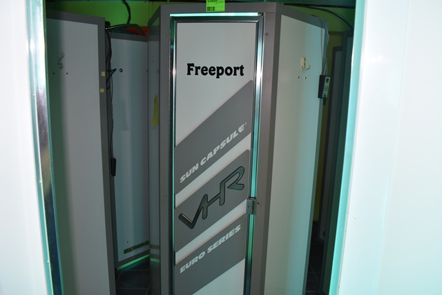 The Sun Capsule Is A Great Space Saver With A 12 Minute Total Tan Time, An Attached Changing Room and Has Built In Speakers and Fan. This Allows Many Options For Placement of This Unit As It Does Not Need To Be Confined To A Room. This Unit Runs With 220V / 70A On 3-Phase Power And Has A Total Of 8,762 Hours. 84" x 88". Buyer Responsible for Safe Disassembly and Removal, Must Provide Certificate of Insurance Prior To Removal Day, Power Will Be Disconnected After Preview Day.