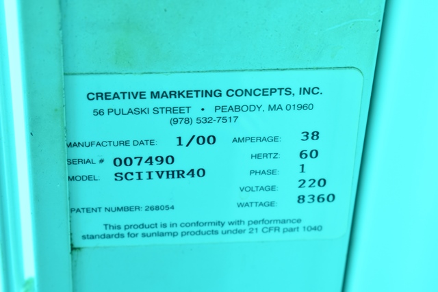 The Sun Capsule Is A Great Space Saver With A 12 Minute Total Tan Time, An Attached Changing Room and Has Built In Speakers and Fan. This Allows Many Options For Placement of This Unit As It Does Not Need To Be Confined To A Room. This Unit Runs With 220V / 70A On 3-Phase Power And Has A Total Of 8,710 Hours. 84" x 88". Buyer Responsible for Safe Disassembly and Removal, Must Provide Certificate of Insurance Prior To Removal Day, Power Will Be Disconnected After Preview Day.