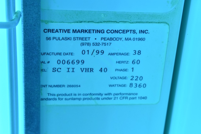 The Sun Capsule Is A Great Space Saver With A 12 Minute Total Tan Time, An Attached Changing Room and Has Built In Speakers and Fan. This Allows Many Options For Placement of This Unit As It Does Not Need To Be Confined To A Room. This Unit Runs With 220V / 70A On 3-Phase Power And Has A Total Of 9,963 Hours. 84" x 88". Buyer Responsible for Safe Disassembly and Removal, Must Provide Certificate of Insurance Prior To Removal Day, Power Will Be Disconnected After Preview Day.