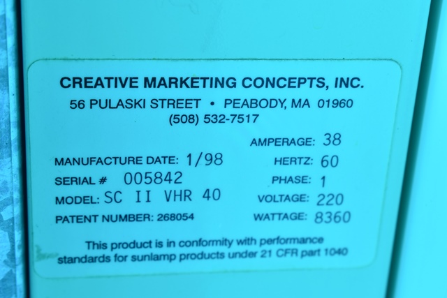 The Sun Capsule Is A Great Space Saver With A 12 Minute Total Tan Time, An Attached Changing Room and Has Built In Speakers and Fan. This Allows Many Options For Placement of This Unit As It Does Not Need To Be Confined To A Room. This Unit Runs With 220V / 70A On 3-Phase Power And Has A Total Of 10,824 Hours. 84" x 88". Buyer Responsible for Safe Disassembly and Removal, Must Provide Certificate of Insurance Prior To Removal Day, Power Will Be Disconnected After Preview Day.