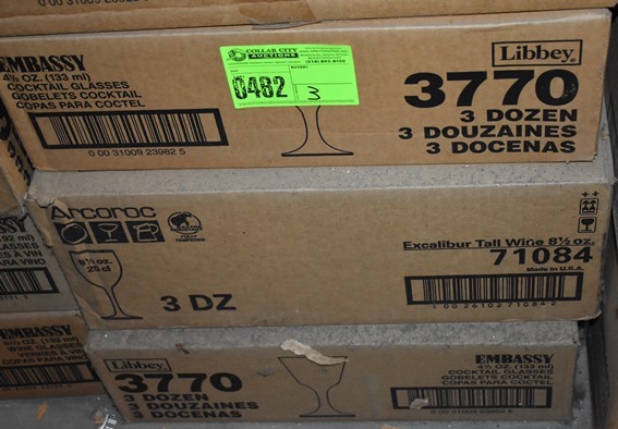 Lot consisting of 1 case Libbey Embassy 4.5 oz Cocktail Glasses, 1 case of Arcoroc Excaliber 8.5 oz Tall Wine Glasses and 1 case of Libbey 4.5 oz Cocktail Glasses