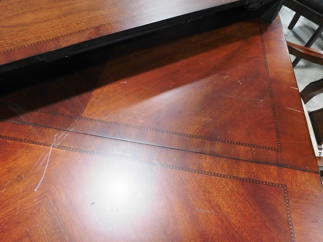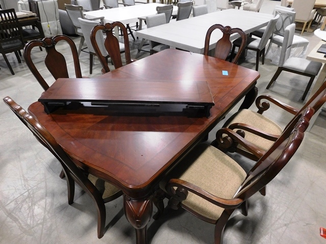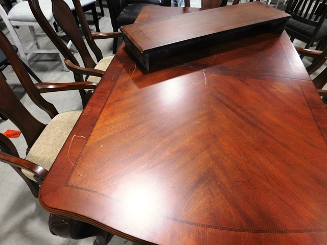Macy's Cherry Dining Table with Leaf and 6 Chairs. Scratches on Top in Photo.