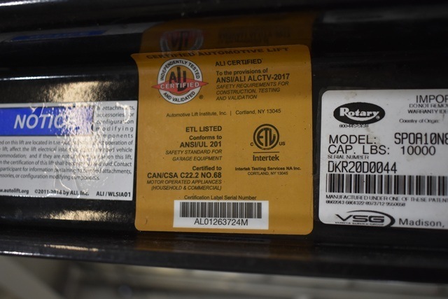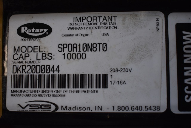 Rotary Lift 10,000lb. Capacity Model#SP0A10N8TO 208-230 Volt Single Phase
