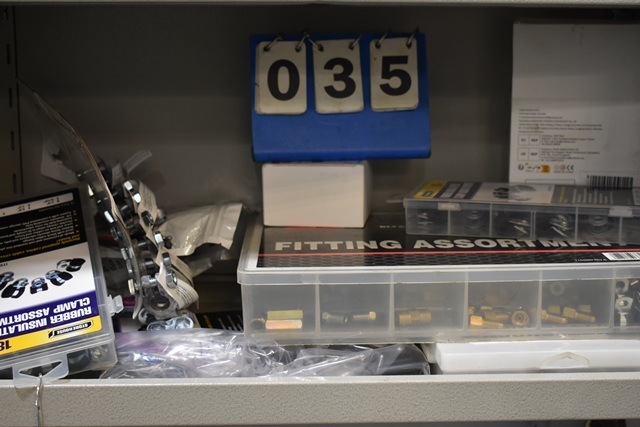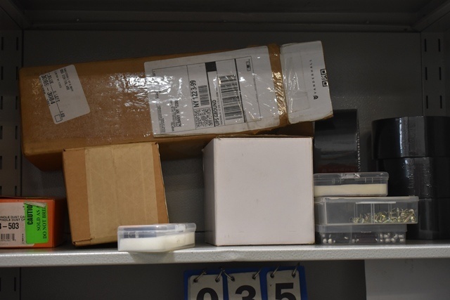 Shelving Unit Contents Only Consisting of Rubber Insulated Clamp Assortments, Battery Terminals, General Purpose Vinyl Tape, Fitting Assortments, etc.