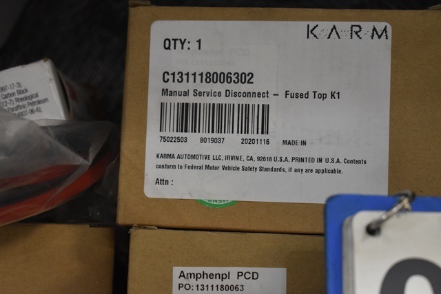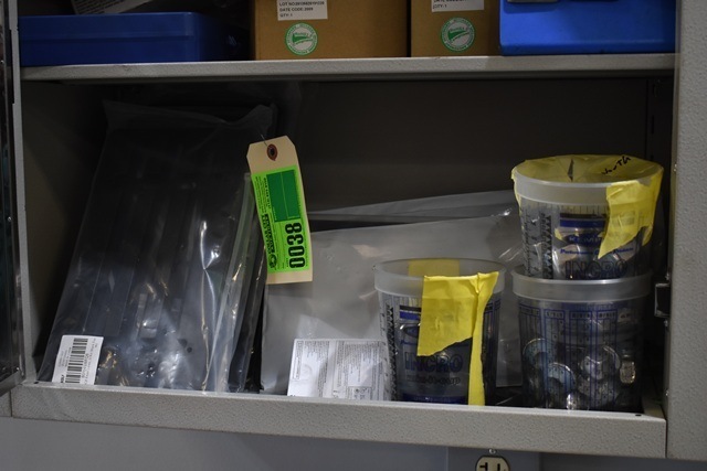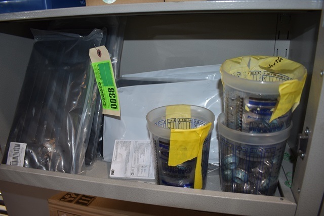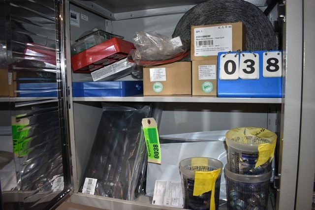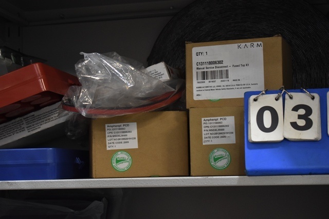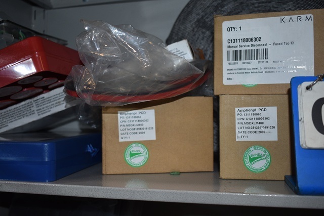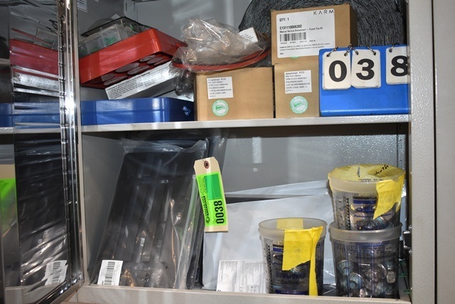 Shelving Unit Contents Consisting of License Plate Brackets, Lug Nuts, Karma Fuses, O-Rings