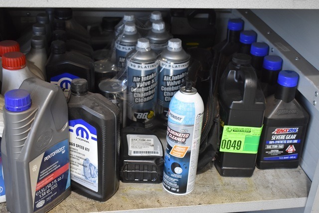 Shelf Lot of Gear Oil and Air Intake Valve and Combustion Chamber Cleaner. Some Are Partially Full