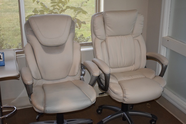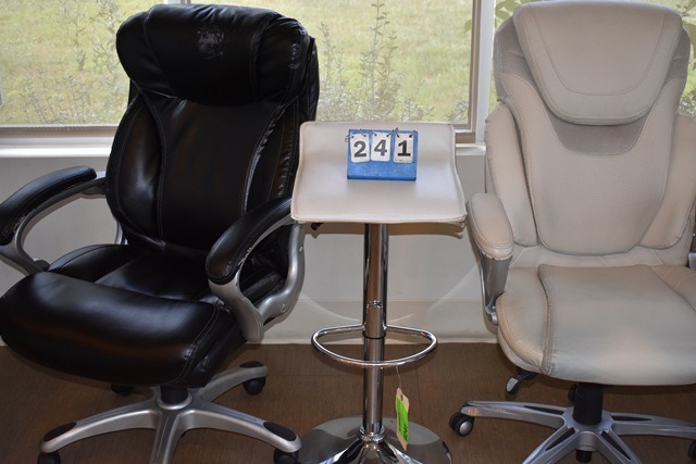 3 Office Chairs. 2 are White, 1 is Black and a White Barstool