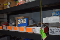 Shelf Lot of Parts Including Mercedes Parts, Ferrari Spark Plugs 254771, Audi Parts, 2014 Land Rover Parts, etc.