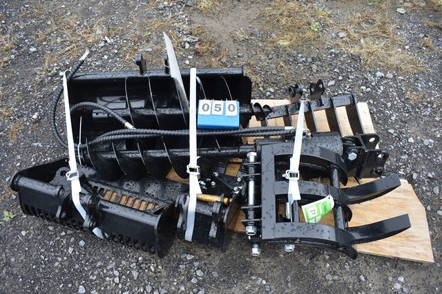 Set of (9) attachment's: (1) 8 in Bucket, (1) 20 in Bucket, (1) 32 in Bucket, (1) Quick Coupler, (1) Ripper, (1) Grapple, (1) Rake, (1) 8 in Auger, (1) 12 in Auger