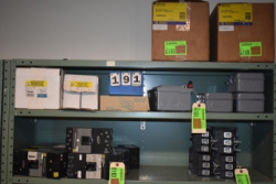 Shelf Lot of Halogen Light Bulbs, Recessed Light Can, and Electrical Outlets