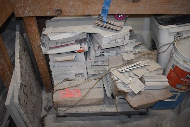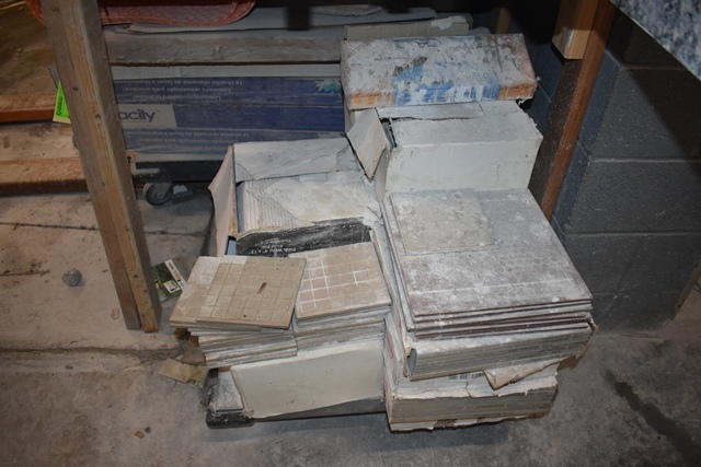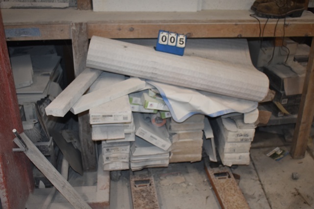 Shelving Contents Consisting of Compass Vinyl Flooring, Ceramic Tile, Assorted Molding