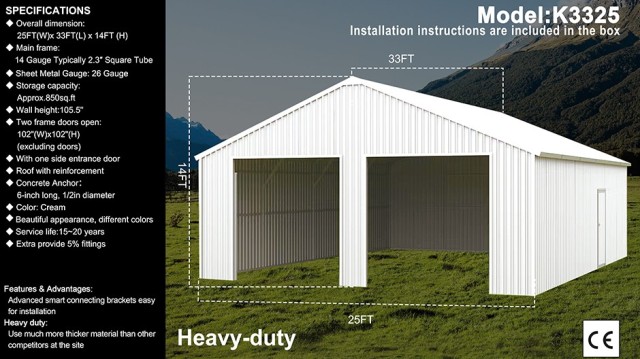 Overall dimension: 25FT(W)x 33FT(L)x 14FT(H)
