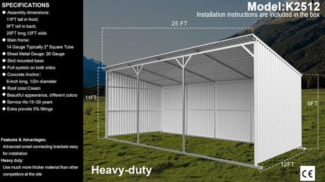 Assembly dimensions: 11FT tall in front; 9FT tall in back; 25FT long, 12FT wide