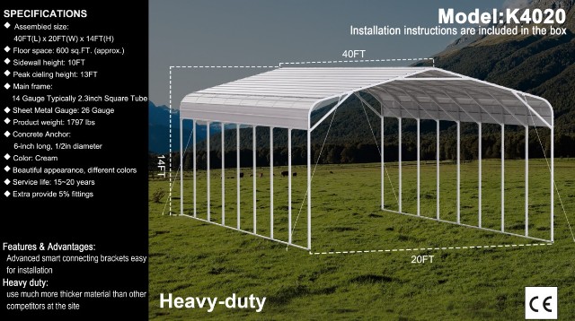 Assembled size: 40FT(L) × 20FT(W) x 14FT(H)