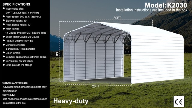 Assembled size: 30FT(L)x 20FT(W)x 14FT(H)