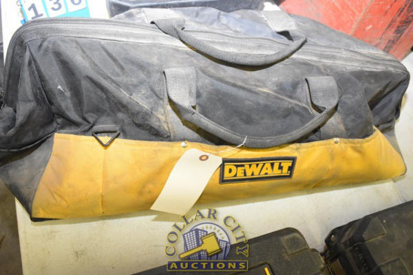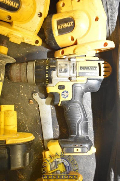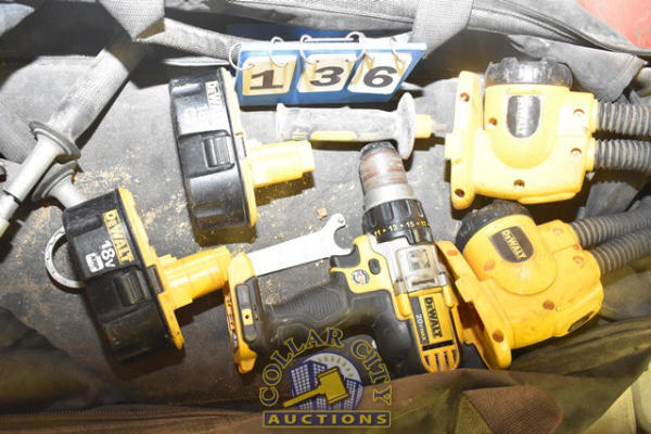 BAG OF DEWALT TOOLS INCLUDING 2 FLASHLIGHTS, A DRILL, 2 BATTERIES, NO CHARGER