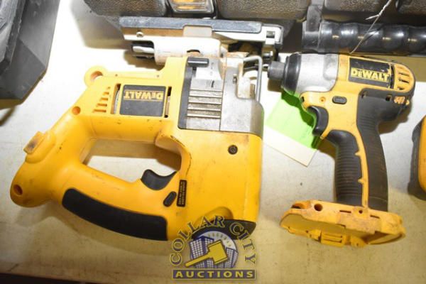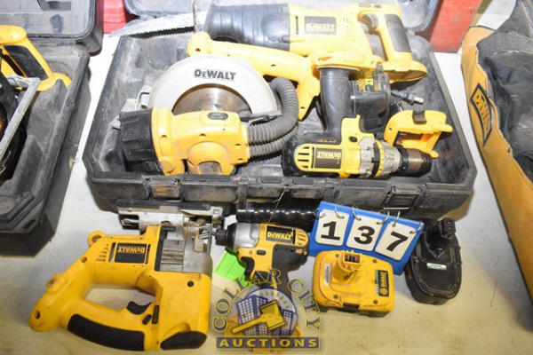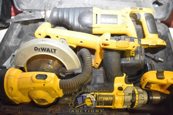 LARGE LOT OF DEWALT 18 VOLT CORDLESS TOOLS INCLUDING SAWZALL, JIGSAW, CIRCULAR SAW, DRILL, INCLUDES 3 BATTERIES AND CHARGER