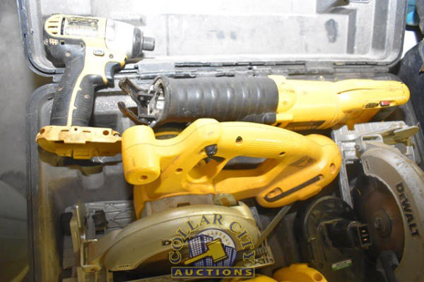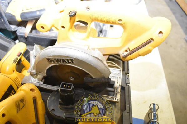 LOT OF DEWALT 18 VOLT CORDLESS TOOLS INCLUDING SAWZALL, CIRCULAR SAW, FLASHLIGHT, AN ADDITIONAL CIRCULAR SAW, AND 1 BATTERY, NO CHARGER