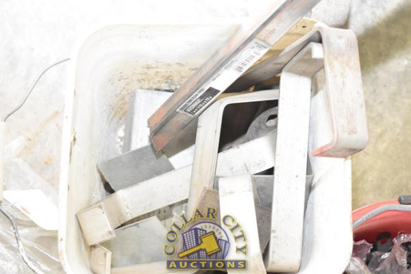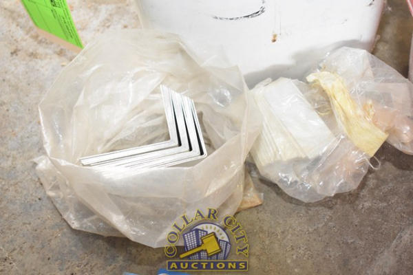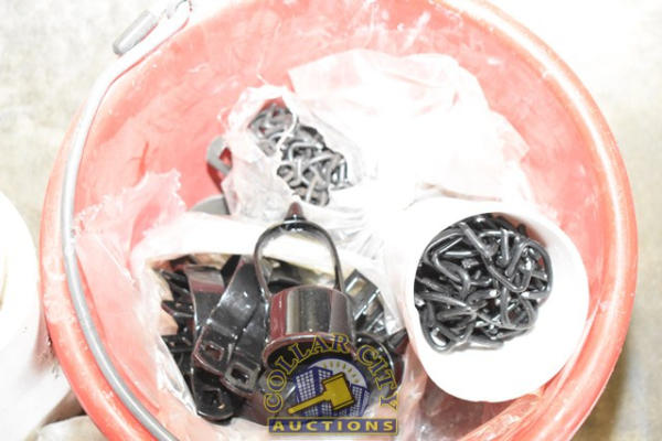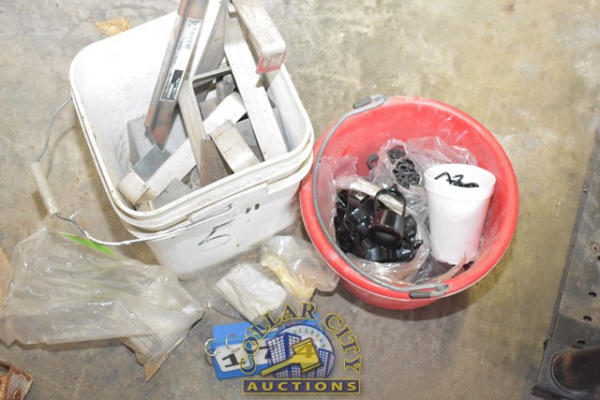 2 BUCKETS OF ASSORTED BRACKETS AND FENCE POST PARTS