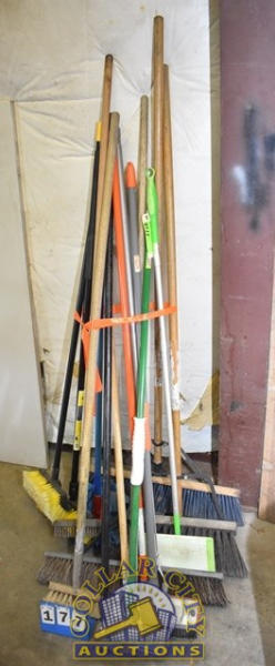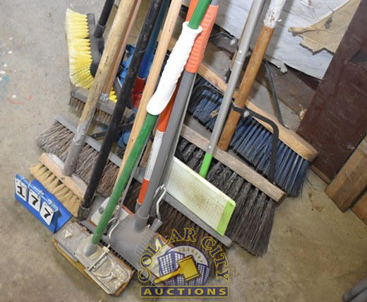 LARGE LOT OF BROOMS, SCRUB BRUSHES, MOPS, ETC.