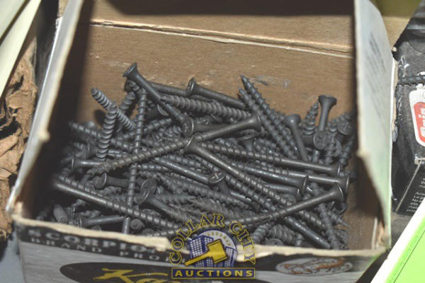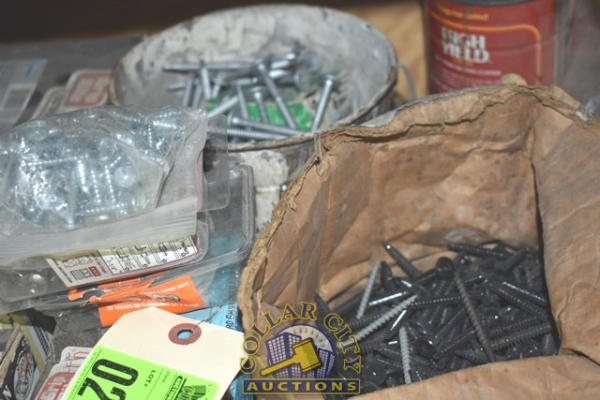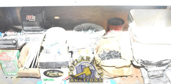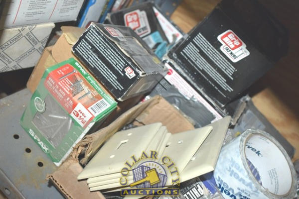 SHELF LOT OF SELF TAPPING SCREWS, ELECTRICAL FACE PLATES, SHEETROCK SCREWS