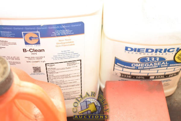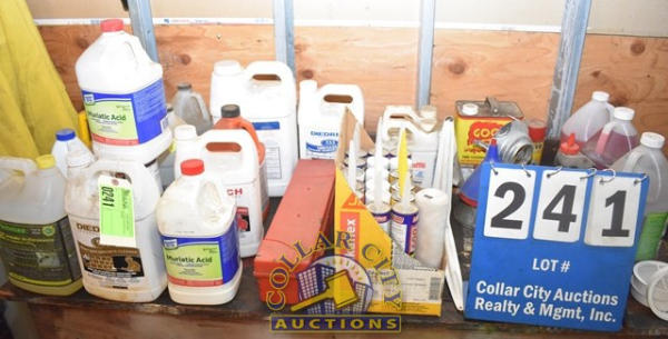 SHELF LOT CONSISTING OF GOO GONE, GRAFFITI REMOVER, CAULKING, SAFETY TRIANGLES, ETC.