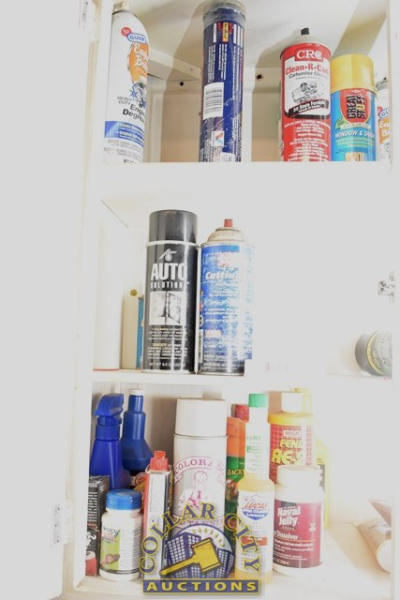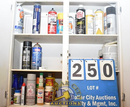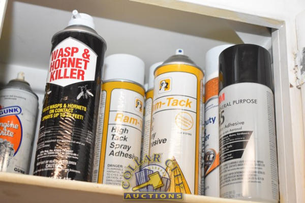CABINET CONTENTS CONSISTING OF HIGH TECH SPRAY ADHESIVE, ENGINE DEGREASER, CARBURETOR CLEANER, INJECTOR CLEANER, ETC.