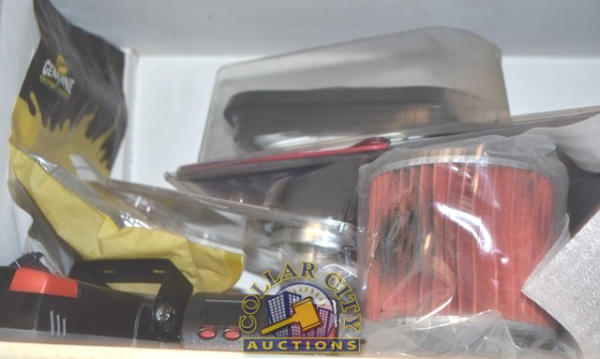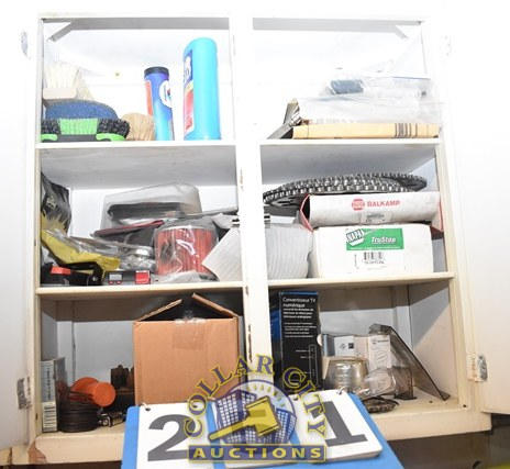 CABINET CONTENTS CONSISTING OF AUTOMOTIVE PARTS, FILTERS, LIGHTS, BRAKE PADS, SPROCKETS, LIGHT BULBS, ETC.