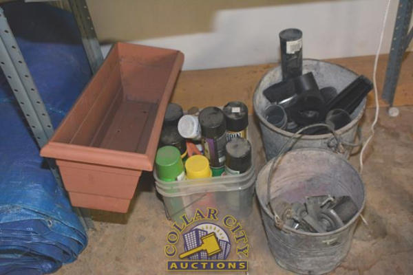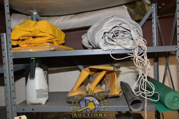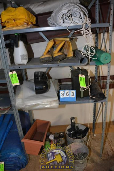 4 SHELF LOT CONSISTING OF RUBBER BOOTS, VACUUM CLEANER PIPE, RADIO, PAINT, VACUUM CLEANER ATTACHMENTS, CASTERS