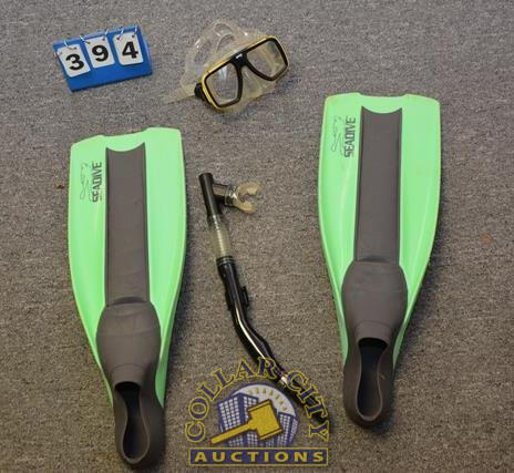 SET OF FLIPPERS, GOGGLES, AND SNORKEL