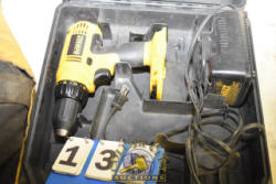 BAG OF DEWALT TOOLS INCLUDING 2 FLASHLIGHTS, A DRILL, 2 BATTERIES, NO CHARGER