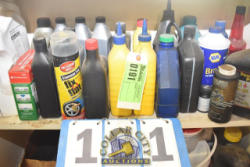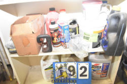 2 SHELF LOTS CONSISTING OF MOTOR OIL, CHARCOAL LIGHTER FLUID, HEATING OIL TREATMENT, HYDRAULIC OIL, ETC.
