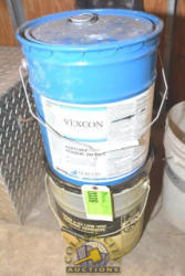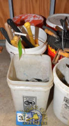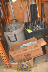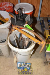 LOT OF CONCRETE TOOLS CONSISTING OF TROWELS, CHISEL, CONCRETE SEALER, ETC.