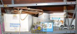 4 SHELF LOT CONSISTING OF RUBBER BOOTS, VACUUM CLEANER PIPE, RADIO, PAINT, VACUUM CLEANER ATTACHMENTS, CASTERS