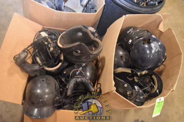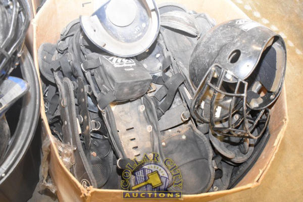 LOT OF ASSORTED BASEBALL GEAR INCLUDING HELMETS, PADS, CLEATS, ETC.