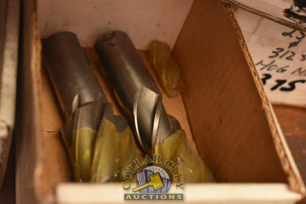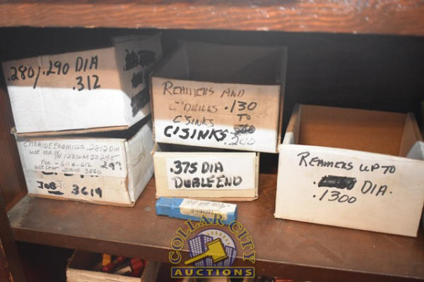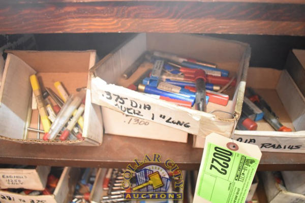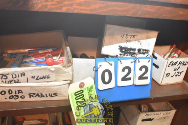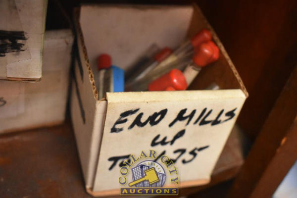 SHELF LOT OF CARBIDE END MILLS, ASSORTED END MILLS, HOG MILLS
