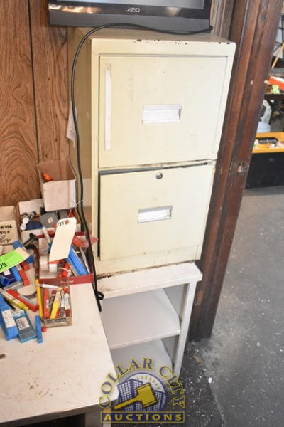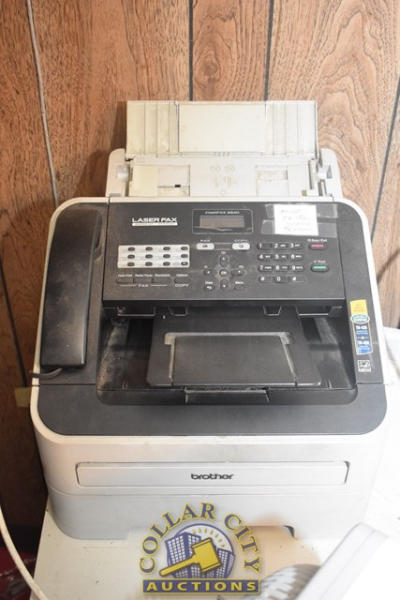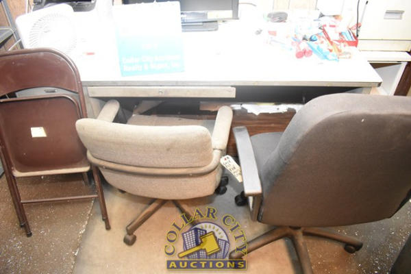 LOT CONSISTING OF DESK (APPROX. 70" WIDE), BROTHER LASER FAX FAX MACHINE, FANS, 3 CHAIRS, 2 METAL CABINETS