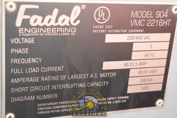 FADAL ENGINEERING VMC2216 VERTICAL MILLING CENTER WITH FADAL CNC 88HS DISPLAY, 230/440, 3 PHASE POWER, MODEL 904-1