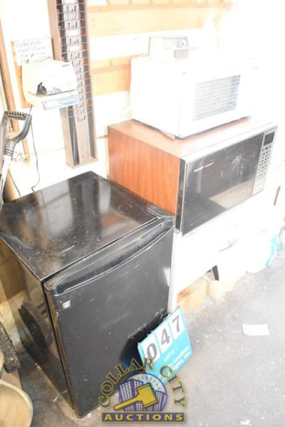 LOT CONSISTING OF SHARP CAROUSEL II MICROWAVE, WHIRLPOOL TIME MASTER MICROWAVE, PENCIL SHARPENER AND A GE MINI REFRIGERATOR (DORMITORY SIZE)