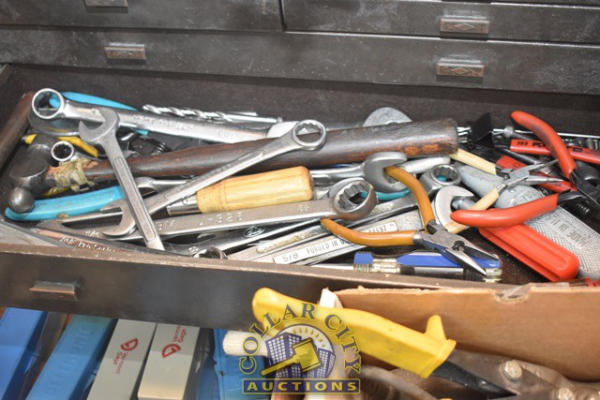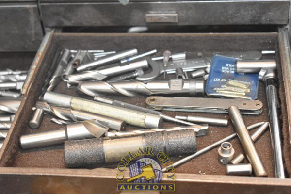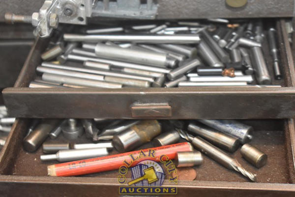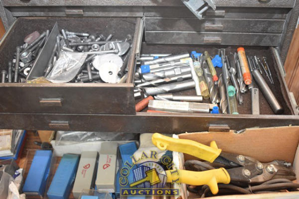 TOOLBOX WITH CONTENTS OF END MILLS, TIN SNIPS, PINS, ETC.