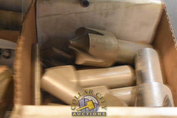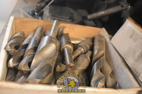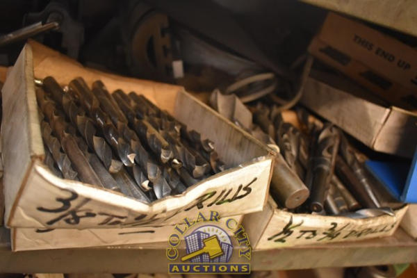 SHELF LOT OF ASSORTED DRILL BITS AND HOLD DOWNS