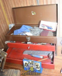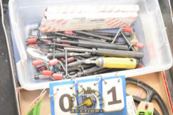 TOOLBOX WITH CONTENTS OF END MILLS, TIN SNIPS, PINS, ETC.