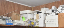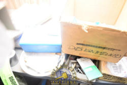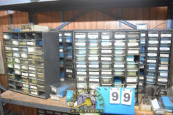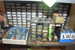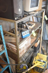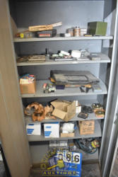 SHELVING UNIT CONTENTS WITH SMALL SHELVING UNIT CONSISTING OF ASSORTED TAPS AND PINS